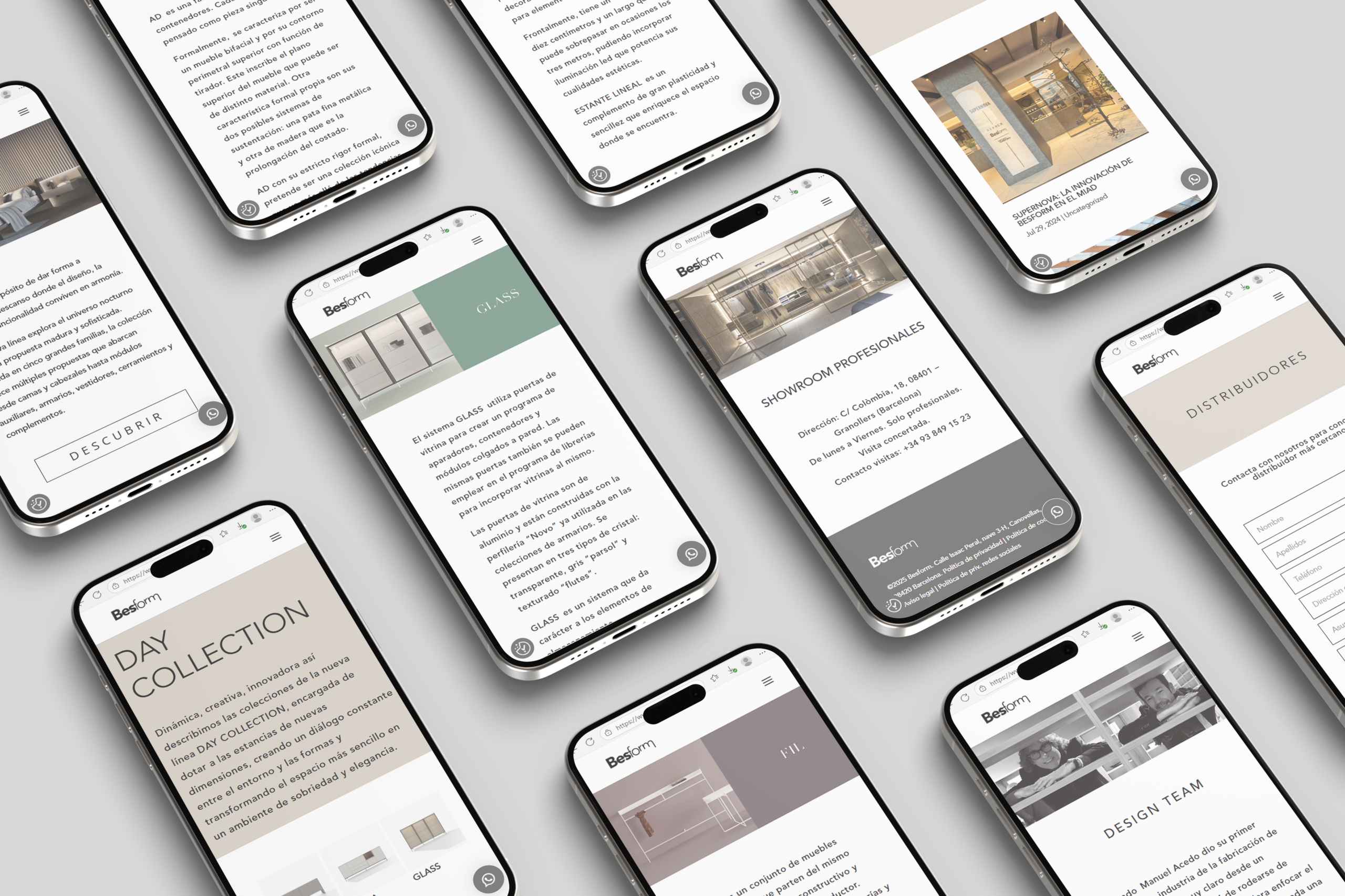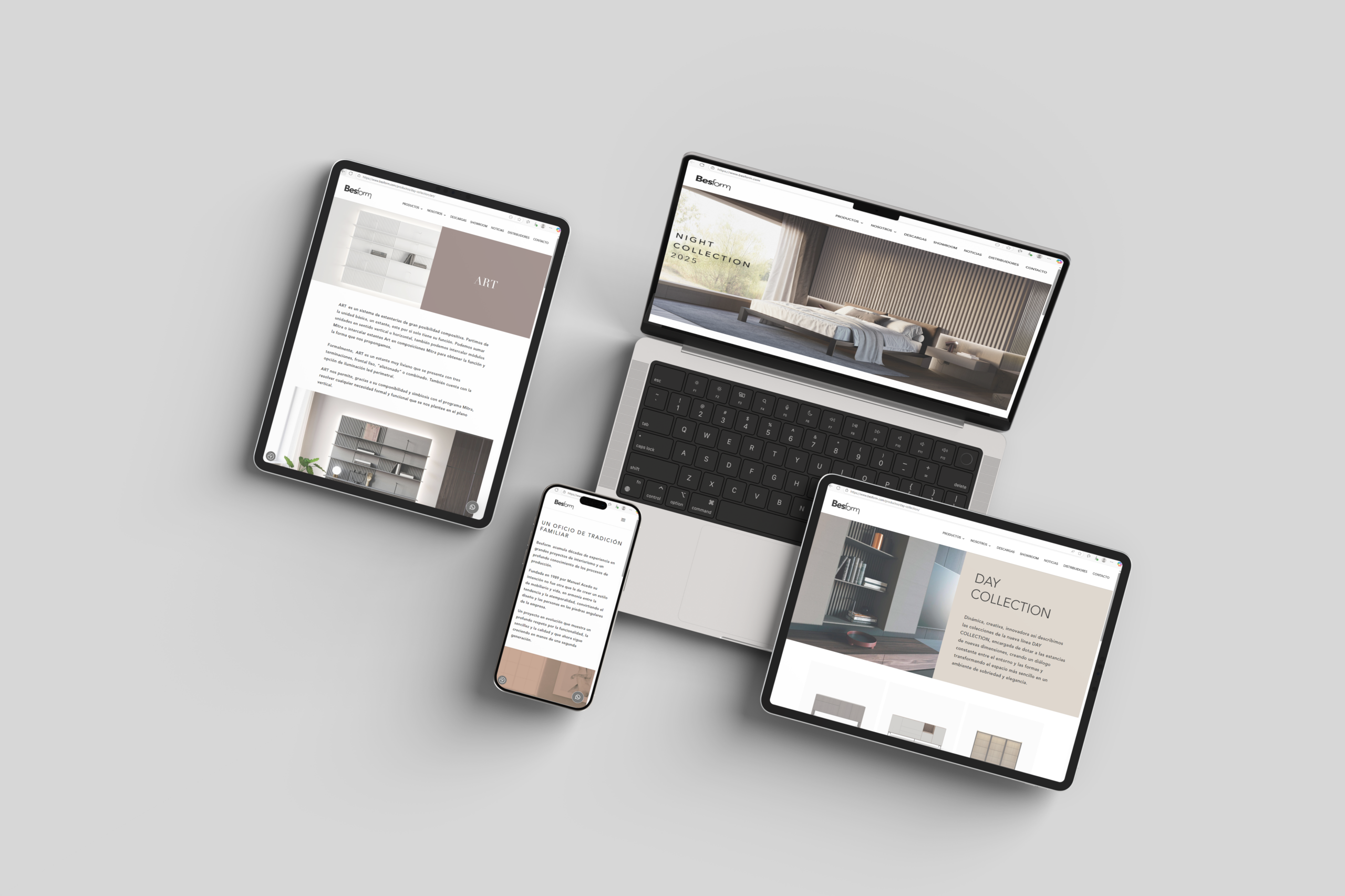 Besform es una fábrica de muebles de diseño con más de tres décadas de trayectoria, especializada en colecciones para zona día (“Day Collection”) y zona noche (“Night Collection”), caracterizadas por la pureza formal, materiales nobles y una visión atemporal. La nueva web debía transmitir ese carácter de alta gama, atención al detalle y personalización, reflejando tanto la identidad de marca como su catálogo integral de productos.