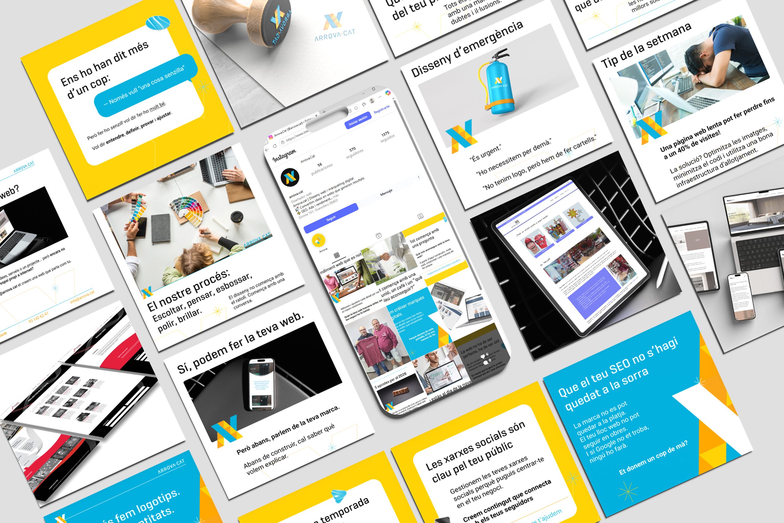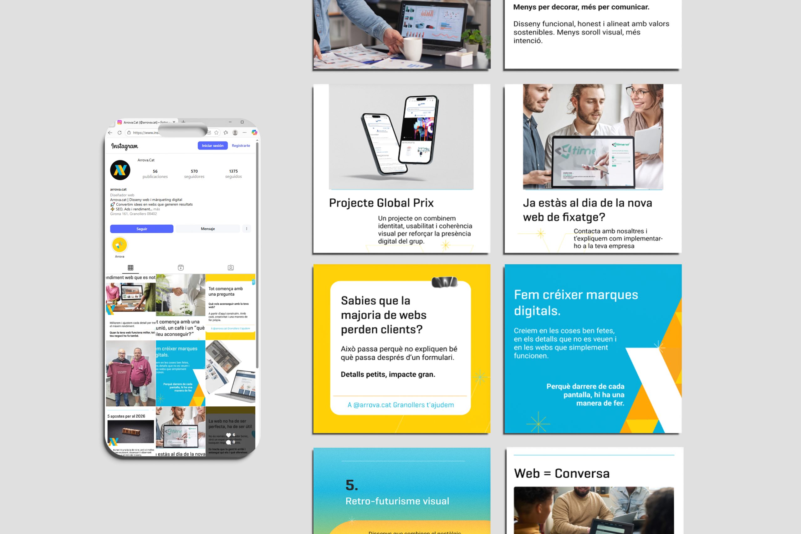 A arrova.cat som un estudi especialitzat en disseny web, màrqueting digital i comunicació en línia. A través de les nostres xarxes socials compartim projectes, processos, coneixement i visió, utilitzant aquests canals com un aparador real del nostre treball i de la nostra manera d’entendre el disseny i l’estratègia digital.