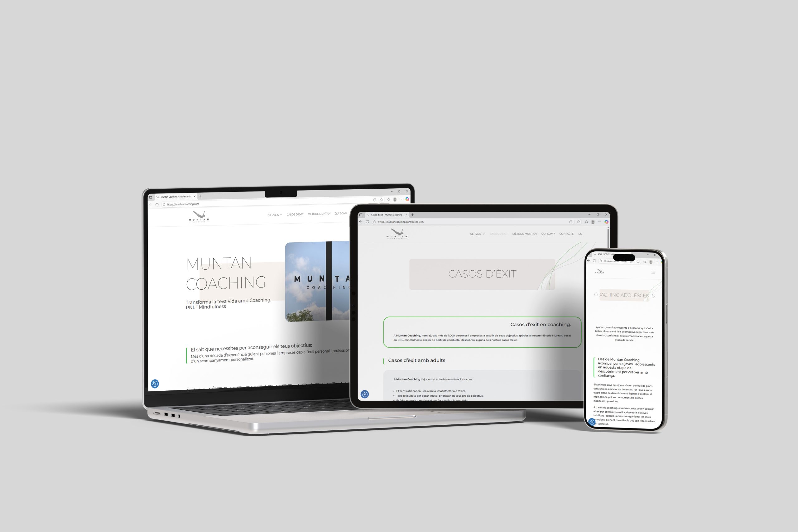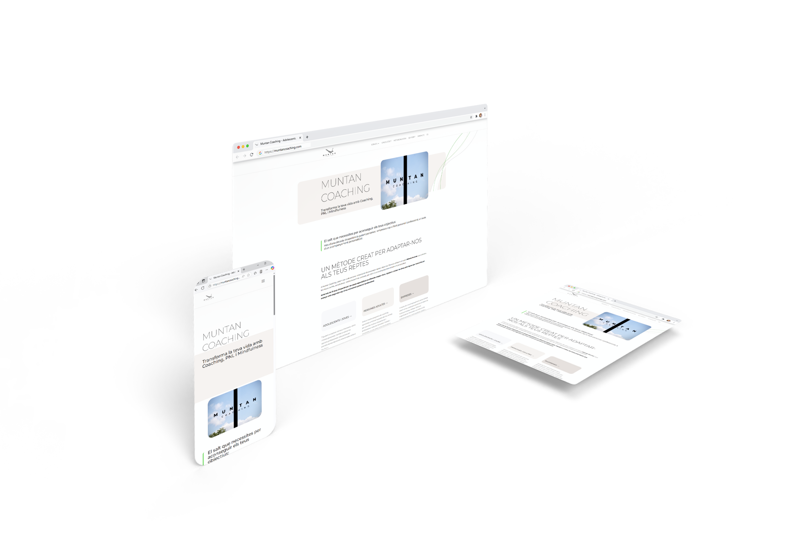 El web de Muntan Coaching presenta una estructura ordenada i accessible, amb seccions diferenciades segons el tipus de públic: adolescents, persones adultes i empreses. Això permet a cada usuari trobar fàcilment la informació que més s’ajusta a les teves necessitats.